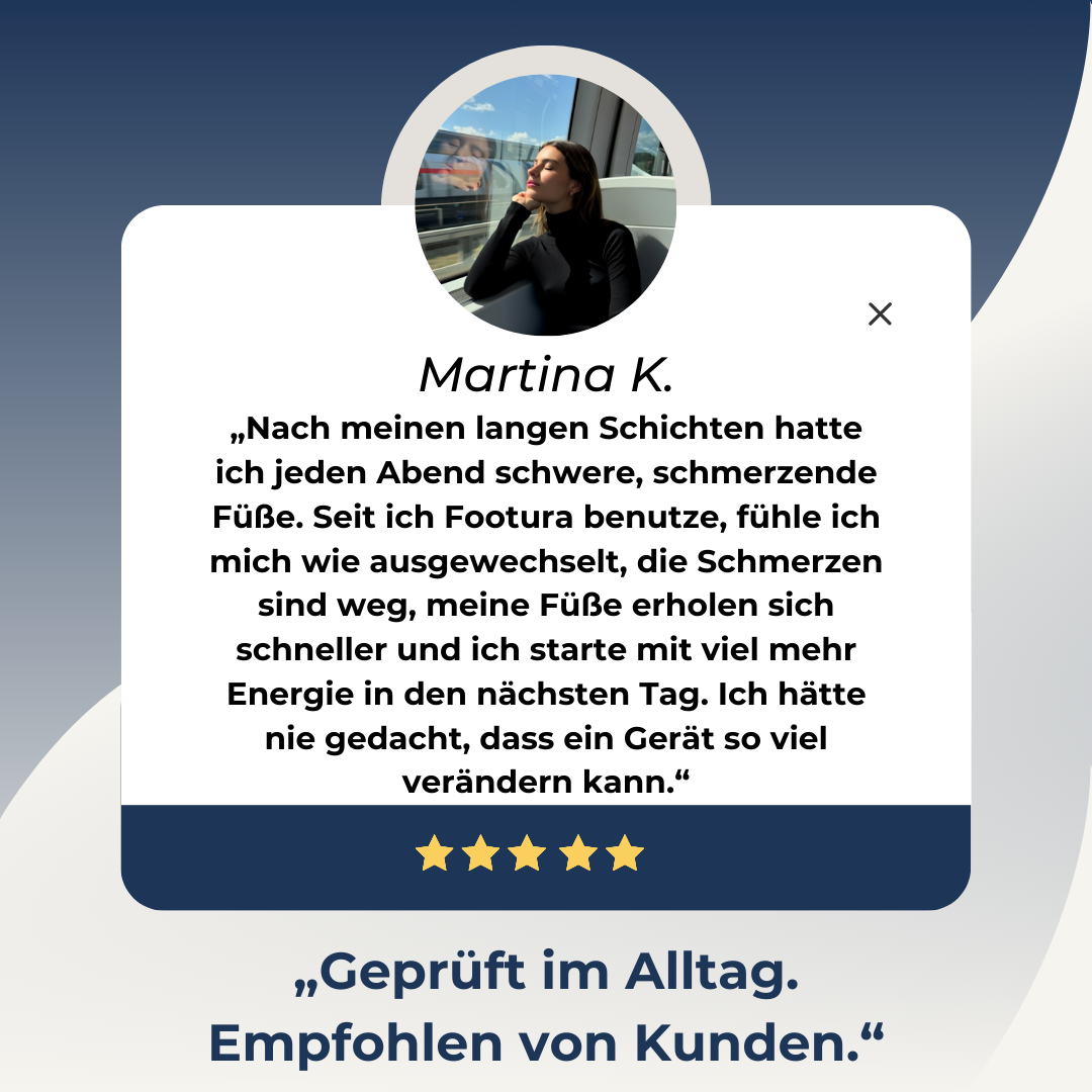 „Nach meinen Schichten habe ich immer mit schmerzenden Füßen gekämpft. Seit ich Footura benutze, fühlt es sich an, als könnte ich endlich richtig abschalten.“