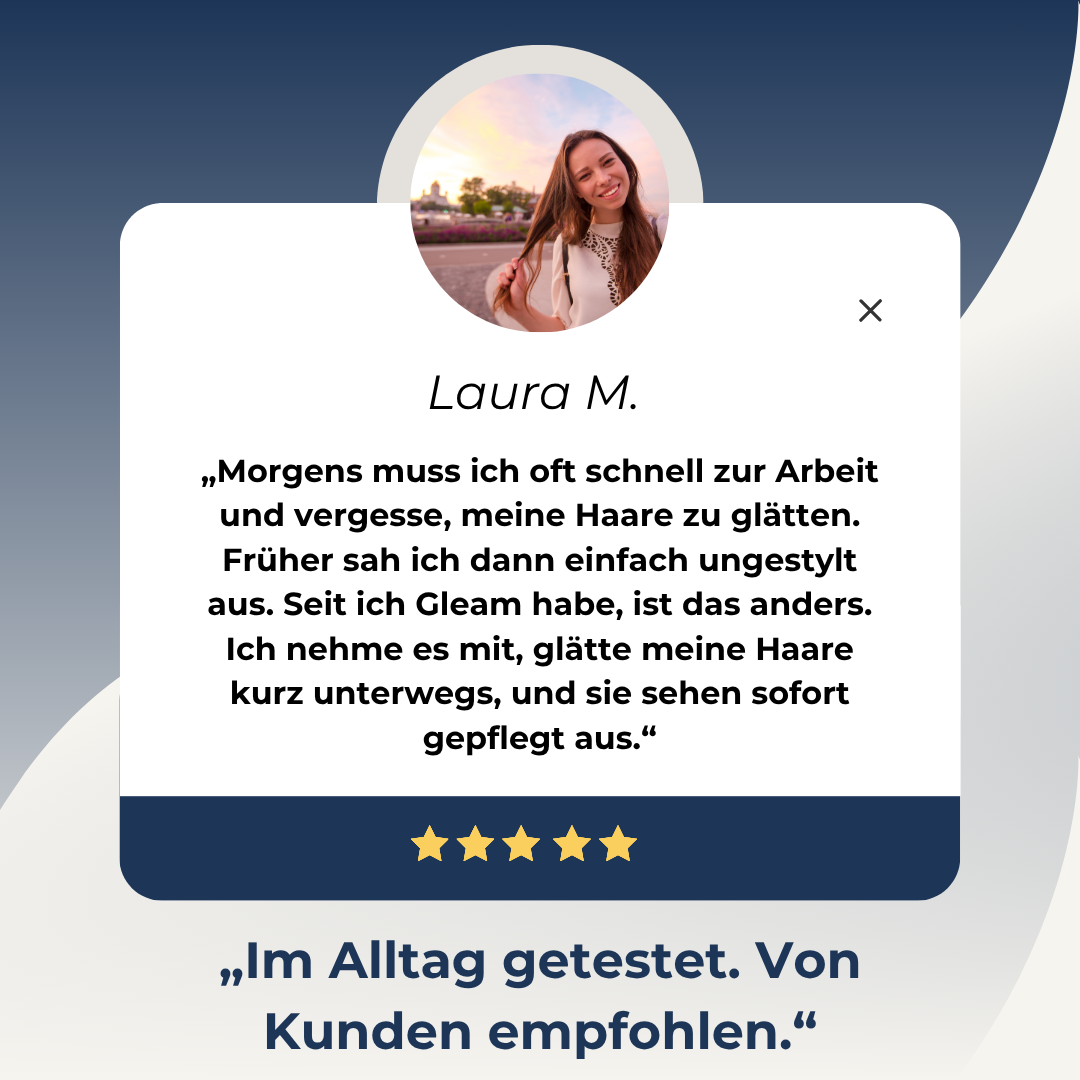 „Ich war erst skeptisch, aber Gleam hat mich echt überrascht. Es ist in Sekunden warm und glättet meine Haare total schnell. Ideal für unterwegs oder wenn’s mal schnell gehen muss.“