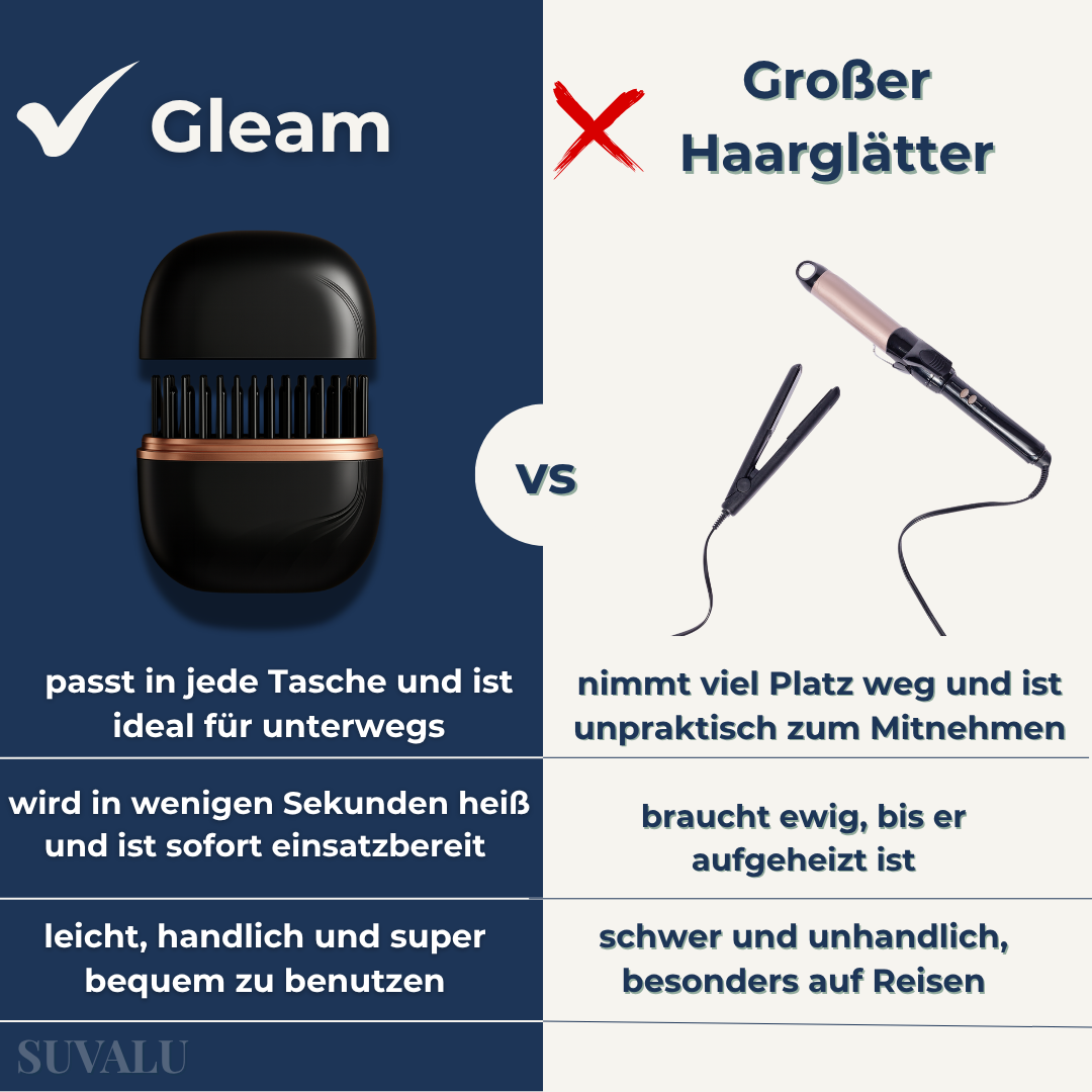 Ja, Gleam ist kompakt, leicht und passt in jede Tasche. Ideal für Reisen, Arbeit oder spontane Stylings zwischendurch.