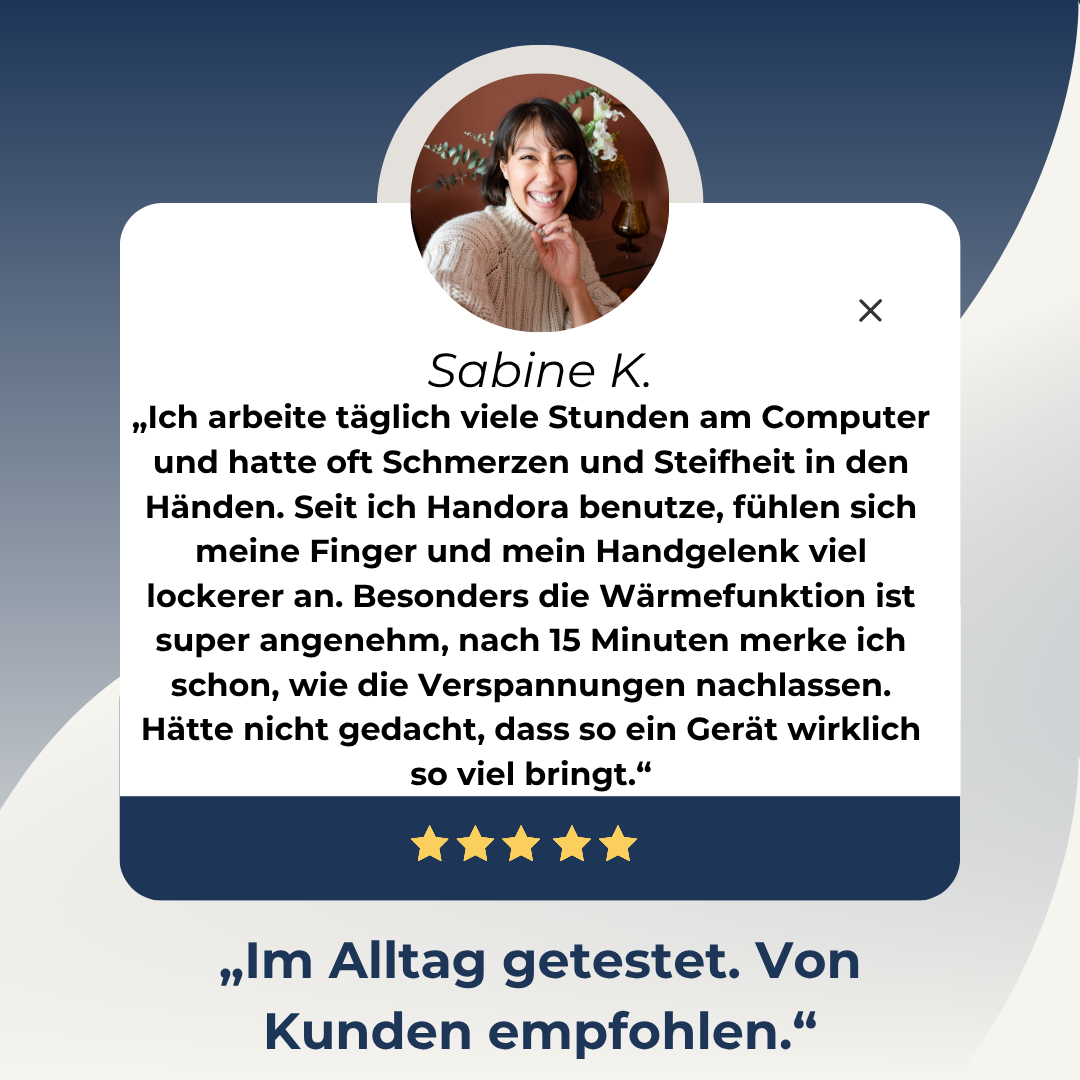„Nach langen Tagen im Büro hatte ich immer müde Hände. Handora mit der Wärmefunktion ist für mich eine echte Wohltat, endlich richtige Entlastung!!“