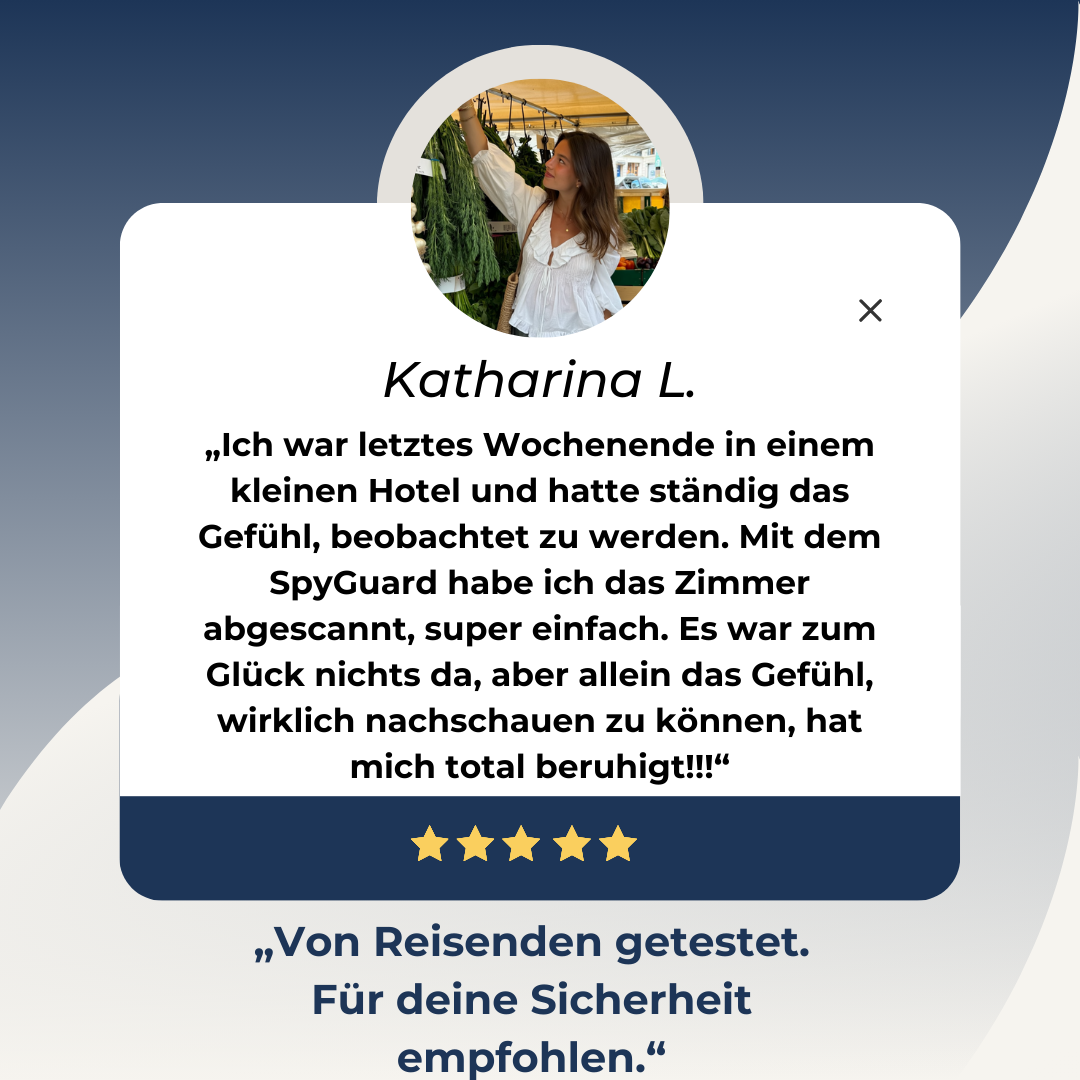 „Im Airbnb hat mein Freund mit SpyGuard tatsächlich eine versteckte Kamera gefunden. Ohne das Gerät hätten wir es nie bemerkt.“